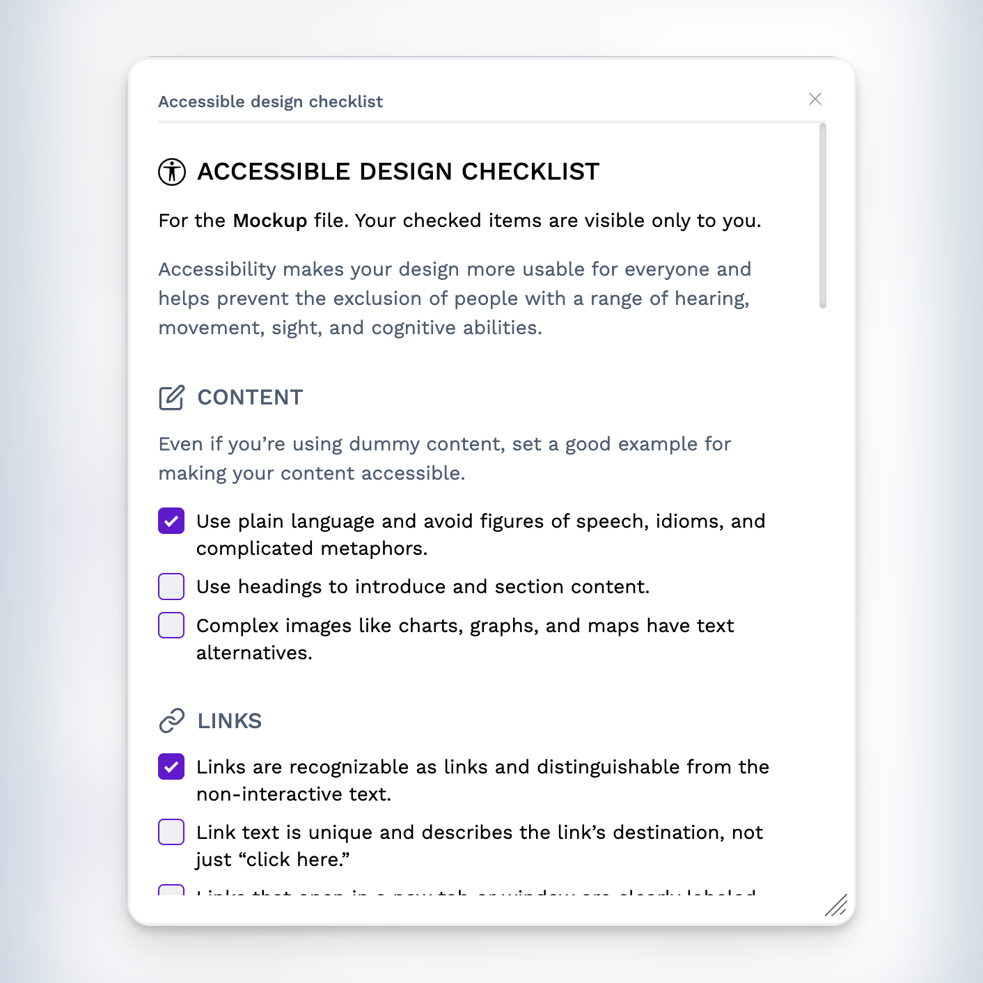 The accessible design checklist items are always the same, but the checked items are saved to your file. This means you can have a separate checklist for each file.