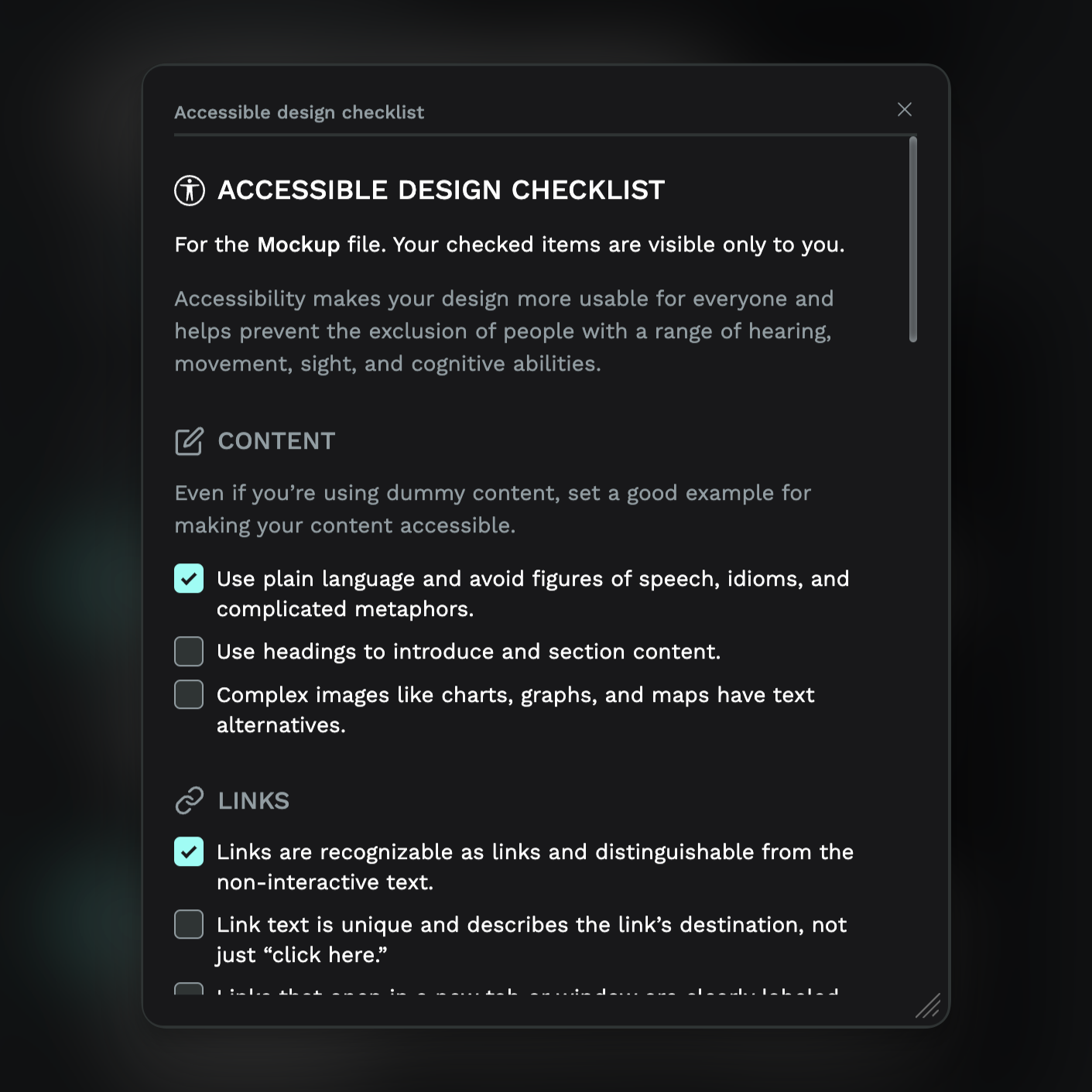 I created this plugin during Piweek, December 2024. It’s a simple checklist to help you learn more about accessibility and make sure you don’t forget any important elements to make your design more accessible.
